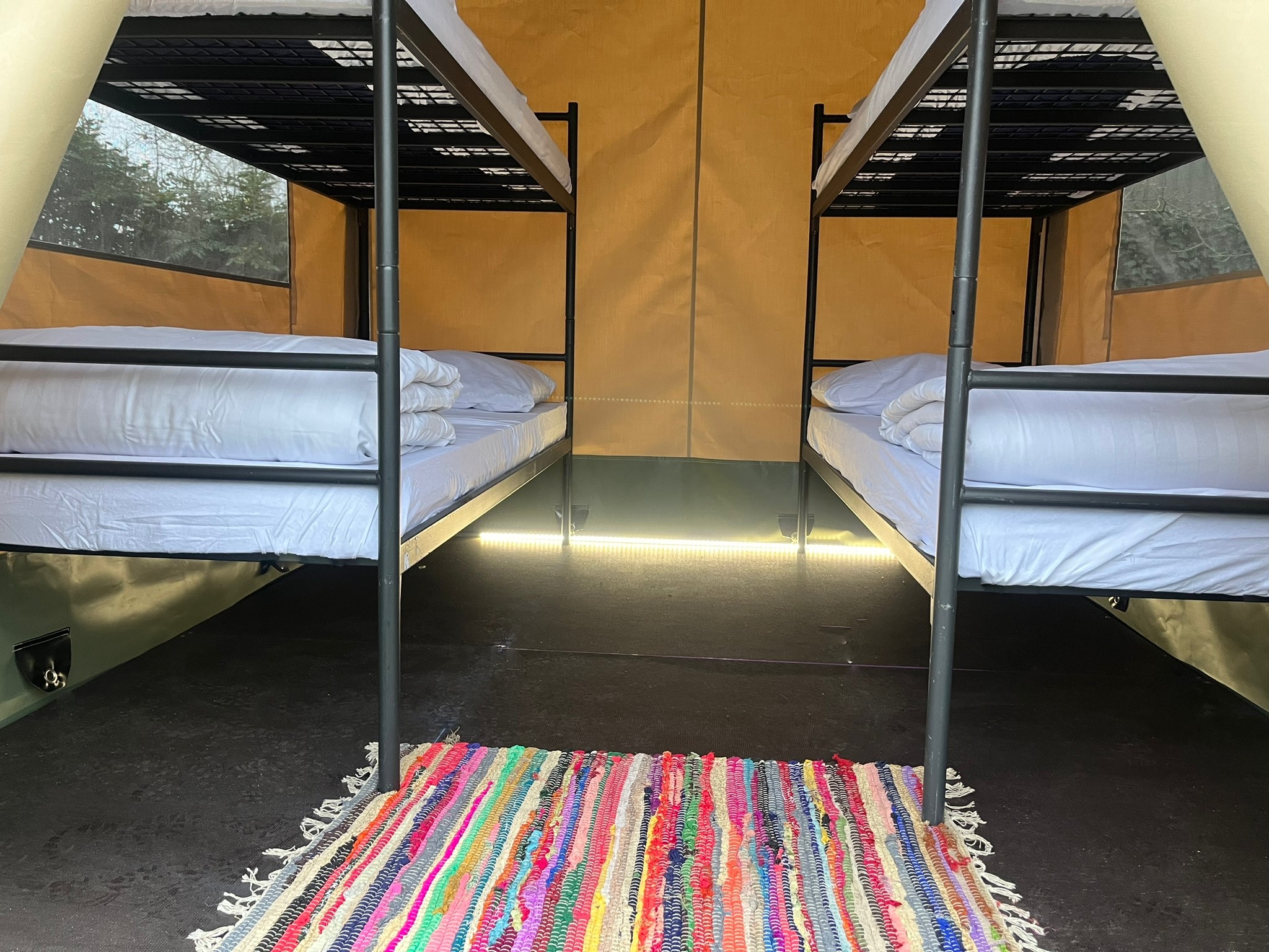 The new Walkers Tent is the sister of the Walkers Cabin. The same comfort but in the shape of a tent. Suitable for 1 to 4 persons. The cabin is 6 m2 and has 2 large windows and a lockable door (bring your own lock).